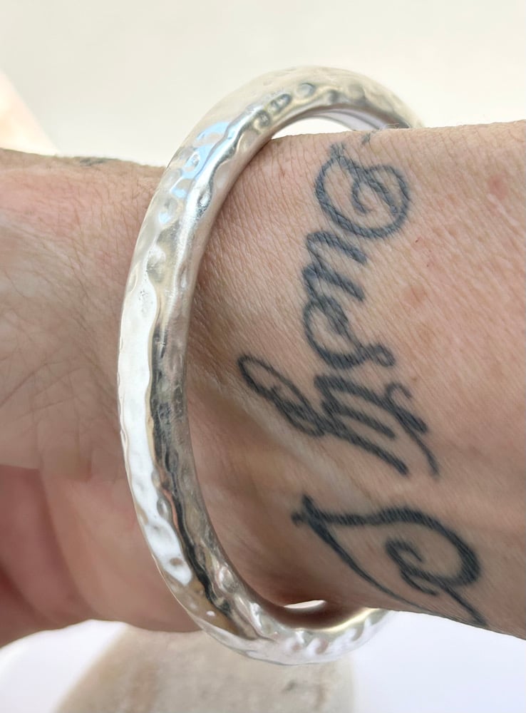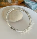 Chunky Sterling bangle, hand forged creating subtle facets that catch and scatter the light with every movement. Its organic and slightly irregular surface adds character, while the smooth inner surface ensures a comfortable fit.
