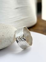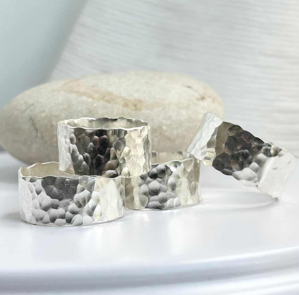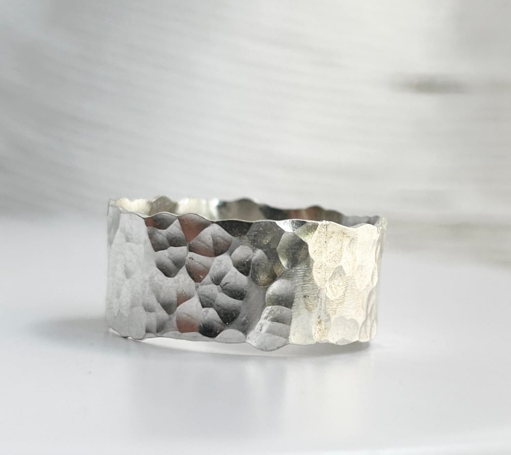 . A wide, sculptural sterling silver band celebrating imperfection, movement, and the beauty of handmade work. This 1cm band is richly hammered for texture, with intentionally uneven edges that feel raw, organic, and wonderfully alive — it’s finished with a satin glow that catches the light beautifully across its textured