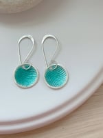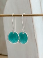 Handcrafted in Sterling Silver, these drop earrings feature a delicately embossed ripple texture beneath translucent sea green enamel. Each piece is individually kiln fired and suspended from handmade sterling silver long ear wire hooks.