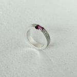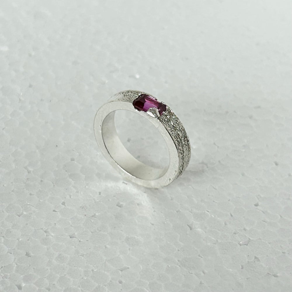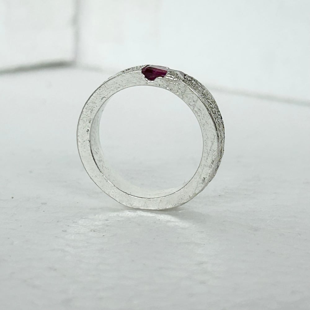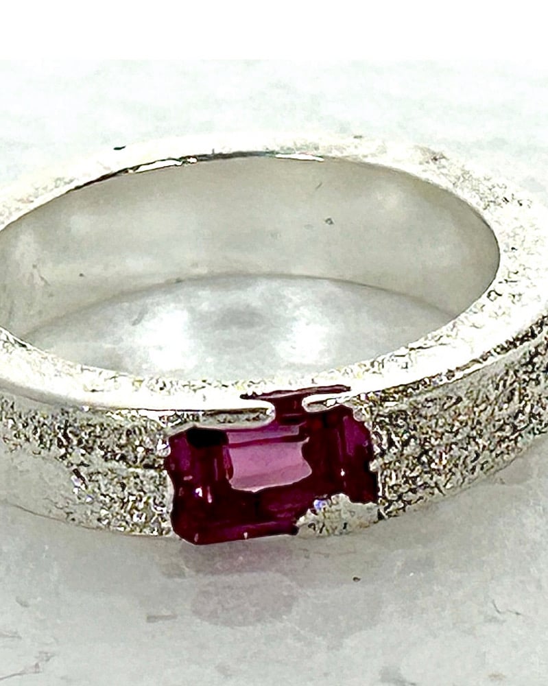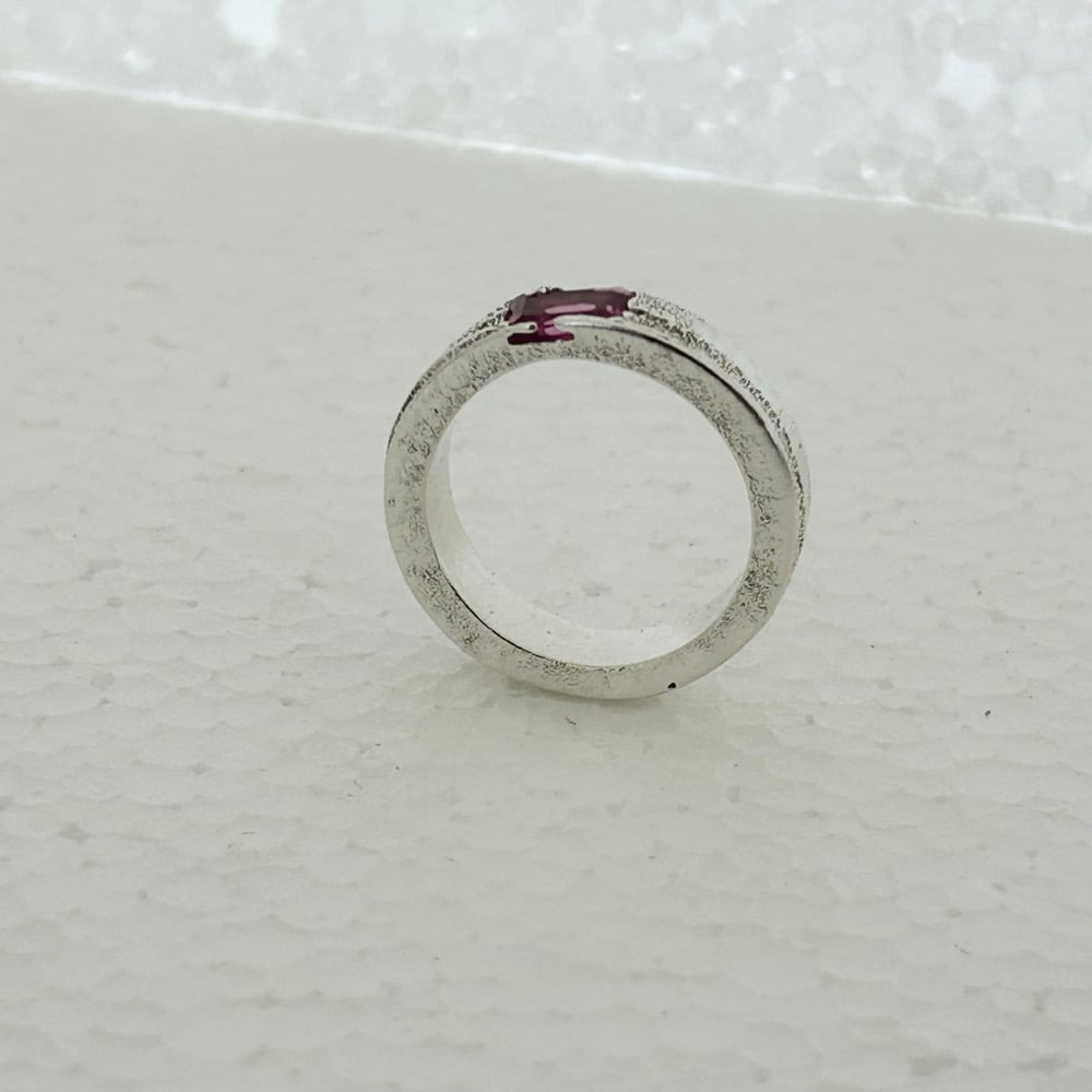 Set into the band is a vivid pink lab sapphire, cut in a geometric step cut that contrasts with the raw texture of the silver. The stone is seated low into the band, allowing the silver to frame and protect it while keeping the profile comfortable for everyday wear.