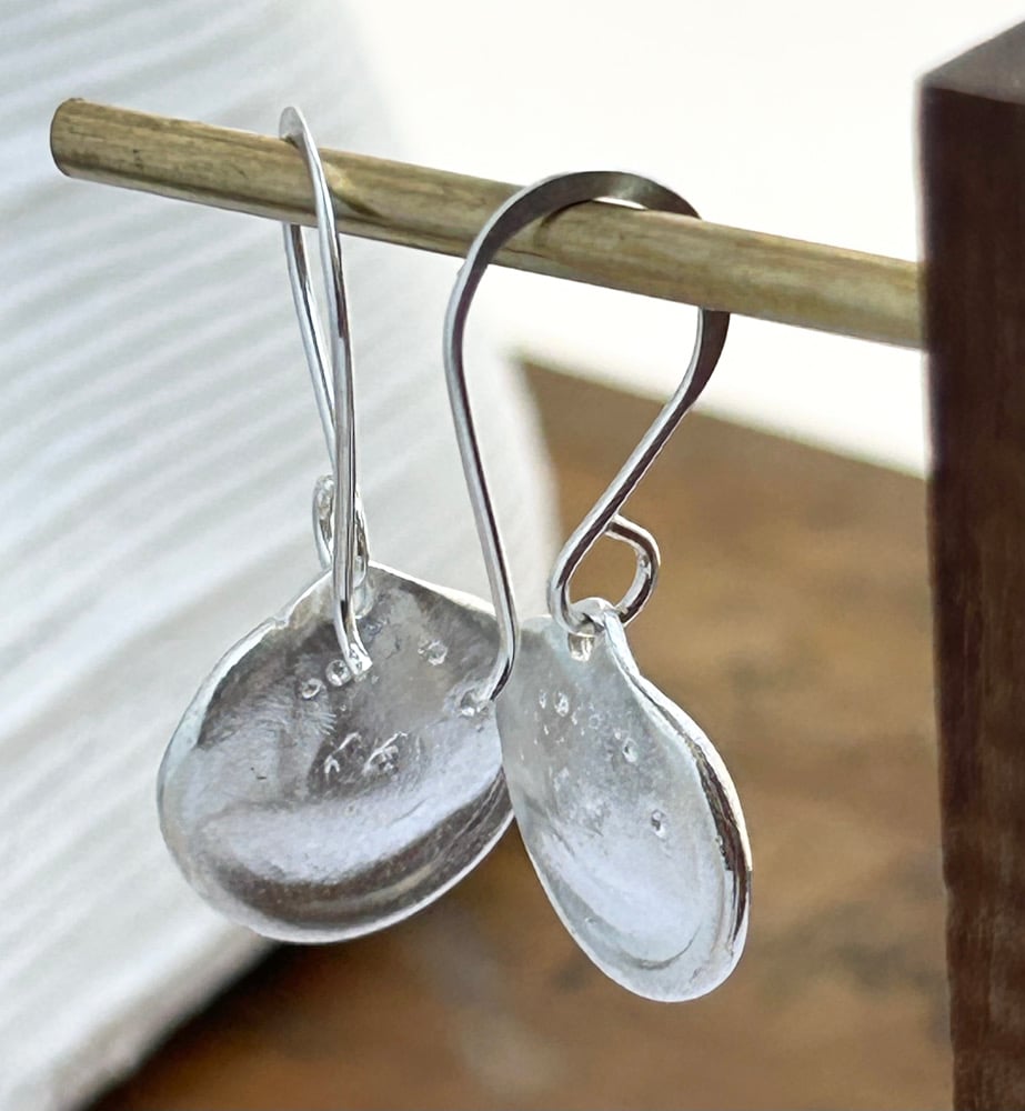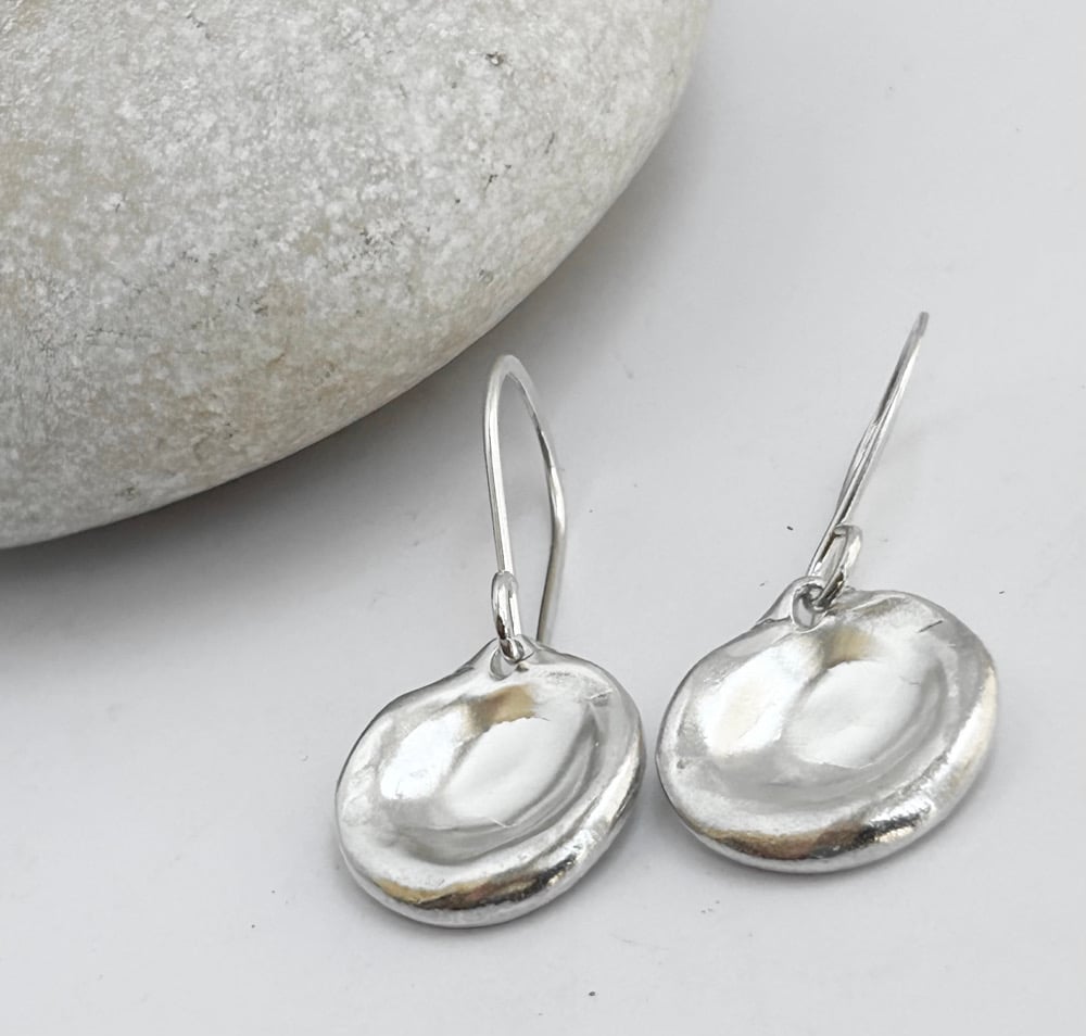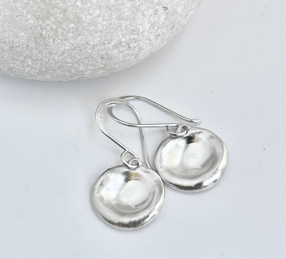 Softly formed in solid sterling silver, these earrings echo the quiet beauty of still water drops. Each disc is shaped in wax, giving it a gentle dome and subtle organic irregularities that catch and reflect the light.